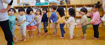 子どもの感覚を育む布おむつ、布パンツの使用を0〜1才児の頃からすすめています。貸しおむつの対応もあります。入園当初は紙おむつの使用もしていますが、保護者の方と相談の上、徐々に切り替えています。